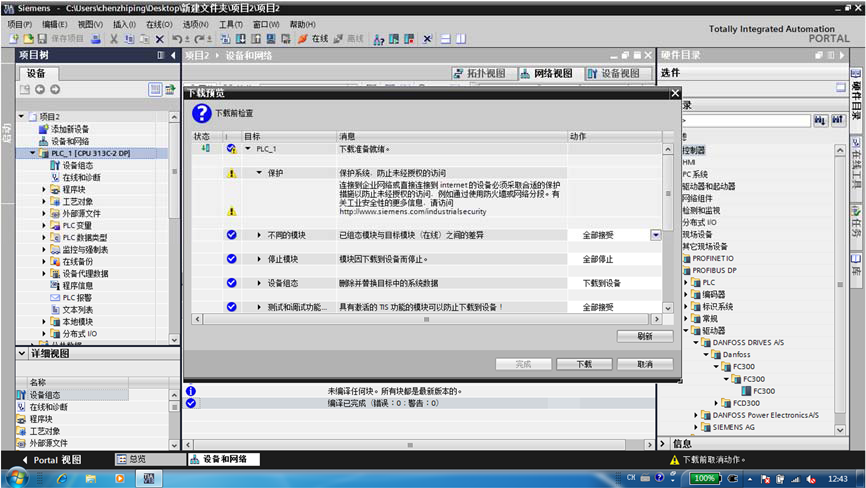 七、:配置丹佛斯變頻器(進(jìn)入‘網(wǎng)絡(luò)視圖’-打開右側(cè)‘硬件目錄’-選擇‘其他現(xiàn)場(chǎng) 設(shè)備’-‘PROFIBUS DP’-‘驅(qū)動(dòng)器’-‘DANFOSS DRIVESA/S’-‘DANFOSS’-‘FC300’-‘FC300’-‘FC300’),將其如圖七所示拖動(dòng)。