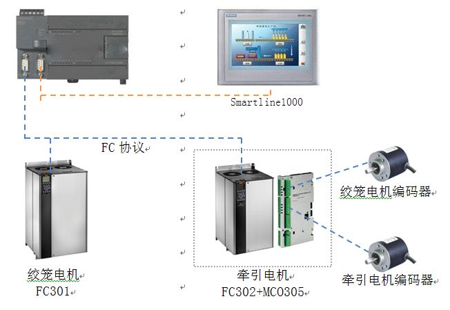PLC的PORT1口與兩臺變頻器在一個總線上,采用FC協議進行通信;PORT0則連接西門子的人機屏。其中牽引電機變頻器FC302上,安裝MCO305選件卡,同時將兩個電機的編碼器都接到MCO305上。由絞籠電機作為主軸,牽引電機作為從軸與主軸同步運動。