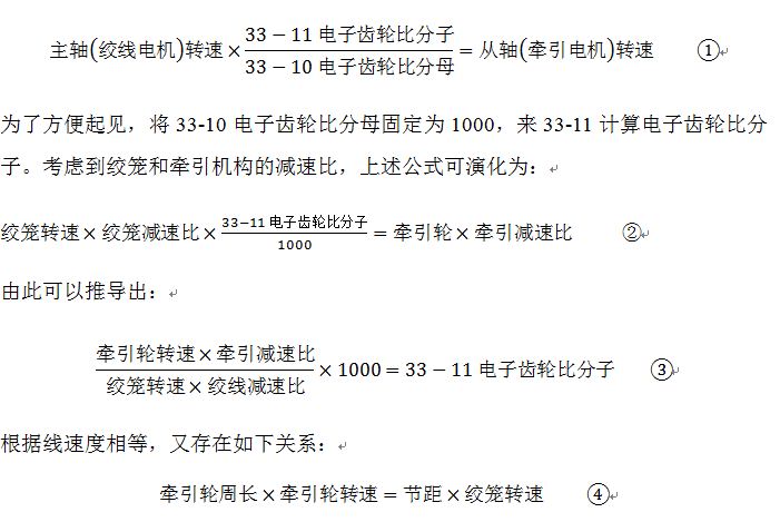 其中,絞籠轉速、節距由操作者給出,牽引輪周長、牽引減速比和絞線減速比取決于機械結構,由以上公式④推導出牽引輪轉速并帶入公式③,即可求出電子齒輪比分子,在計算的過程中須保證單位統一,計算出的電子齒輪比分子轉化為整數并通過FC協議寫入FC302的33-11參數。