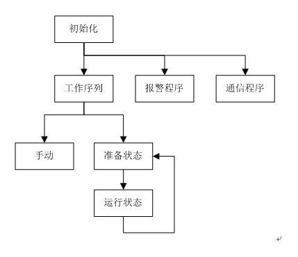開機后,首先進行通信和狀態的初始化。初始化完成后同時調用工作序列、報警和通信子程序。工作序列中,包含手動和自動兩種狀態,自動運行又包括機組準備(包括:松開機械抱閘、關閉防護門等動作)和機器運行兩個狀態。報警程序用于對機器狀態進行實時監控,并根據故障情況執行相關動作。通信程序用于PLC和變頻器的FC協議通信。
