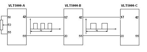 系統由5臺VLT5000系列變頻器及輔助的開關、指示燈、電位器及必要的空開等電氣器件組成。圖-1中A變頻器的速度作為主速給定(它自身的速度由外部電位器給定), A變頻器的42號端子對應自身輸出轉速,自動的轉化為脈沖信號(頻率)輸出給B變頻器,作為B變頻器的速度給定信號(通過B變頻器的29號端子來接收脈沖信號),然后再由B變頻器通過修改內部參數327號,經過計算后相應的輸出一定的轉速。同理B變頻器對應自身輸出轉速自動的轉化為脈沖信號(頻率)通過42號端子輸出脈沖信號(頻率)作為C變頻器的速度給定信號(通過C變頻器的29號端子來接收脈沖信號),以此類推,一直到E變頻器。在此過程中,所有速度給定信號都是數字式的(既速度信號通過給定的脈沖頻率的變化,結合自身內部的計算實現不同的轉速)。