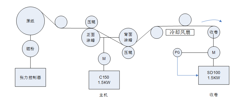 整機(jī)以涂蠟部位作為主機(jī),收卷采用錐度張力收卷,整機(jī)速度在150-200 m/min運(yùn)行。