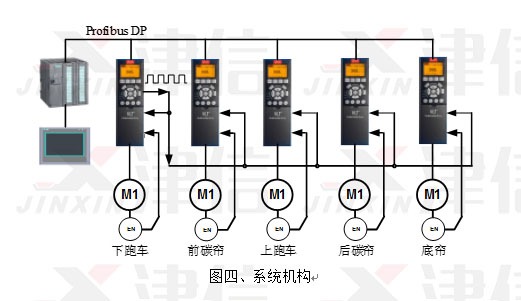 驅動系統的整體結構如圖四,每根軸獨立按自己的電子凸輪曲線運行,屬于典型的分布式控制系統,對主控制器的性能要求,一般的PLC就能勝任。由于每根軸都與主軸保持電子凸輪同步關系,所以總體上可以實現多軸同步的控制需求。其中下跑車運動控制器比較特殊,他具有虛擬主軸脈沖輸出的功能,代替主控制器發送主軸脈沖信號。