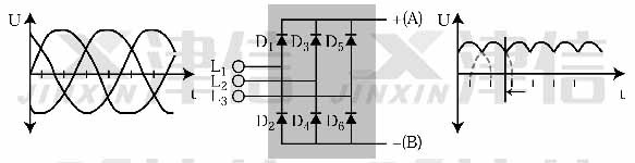 圖1是變頻器整流部分的結構及工作原理圖。變頻器通過三相整流橋將輸入側的三相交流電壓整流為帶有六脈沖尖峰的直流電壓。原來每一相的反相半個周期電壓疊加在正相電壓之上,因此在直流電壓上產生了周期為1/6正弦周期的脈沖波紋。