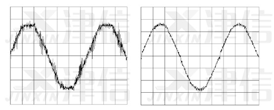 u  圖9所示是加裝直流電抗器以后測量到的電源電壓的波形。可以看出電源電壓得到了明顯的改善,平頂波消失了,傳導干擾明顯減小。電源電壓更接近于平滑的正弦波。