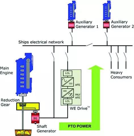 并網(wǎng)變流器與電源管理系統(tǒng)一起還允許電力雙向流動(dòng) - 從軸帶發(fā)電機(jī)到船舶電網(wǎng) (PTO)。