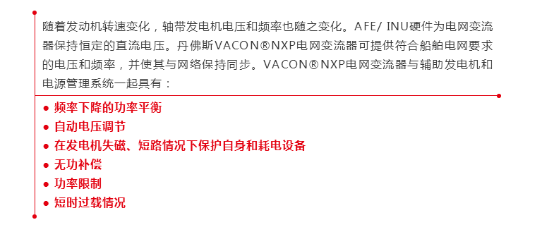 VACON®NXP電網(wǎng)變流器由VACON® AFE單元、船舶電網(wǎng)上的LCL濾波器以及專用軟件組成。集成了AFE/逆變器與VACON®NXP電網(wǎng)變流器的套件被安裝在軸帶發(fā)電機(jī)和船舶電網(wǎng)之間。如圖所示,通過兩個(gè)輔助發(fā)電機(jī)和軸帶發(fā)電機(jī)的幫助,為重載耗電設(shè)備提供恒壓恒頻的電力。